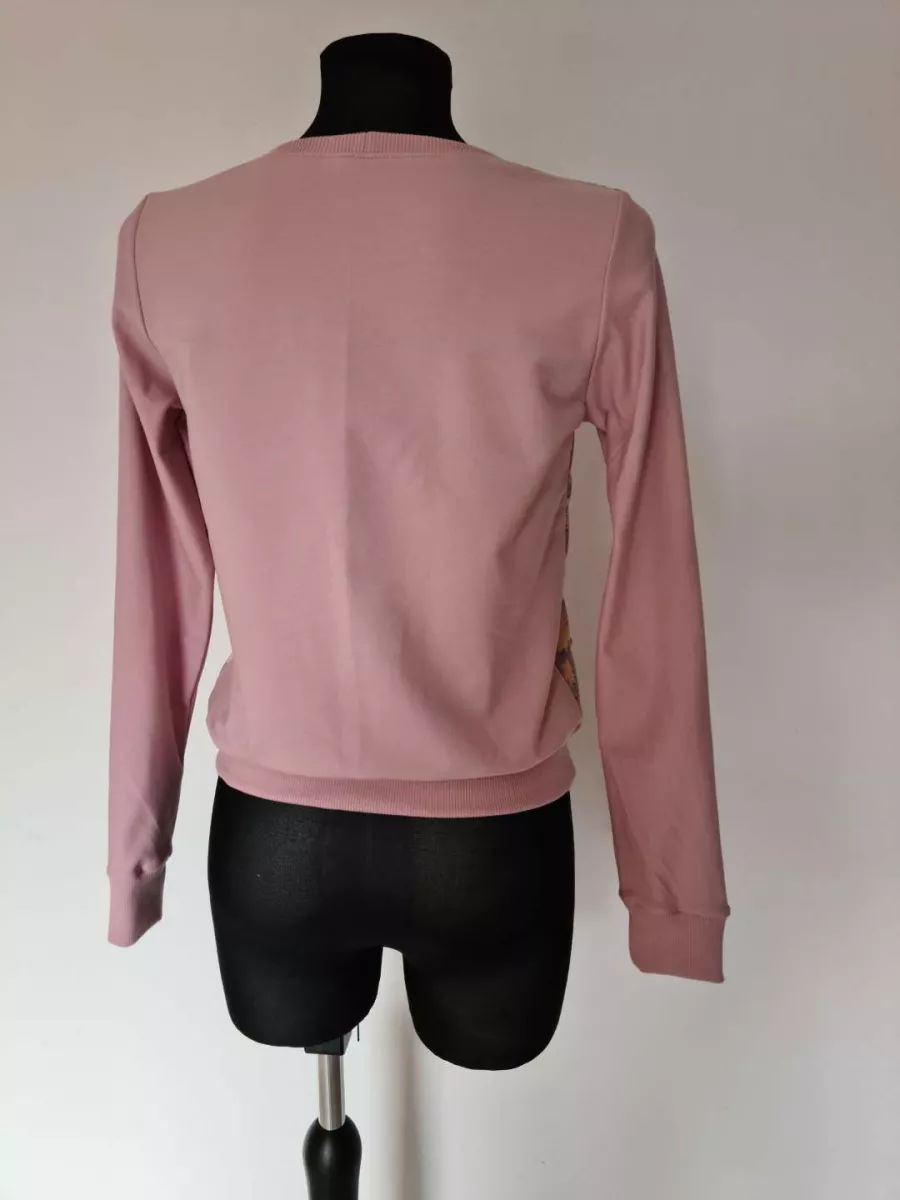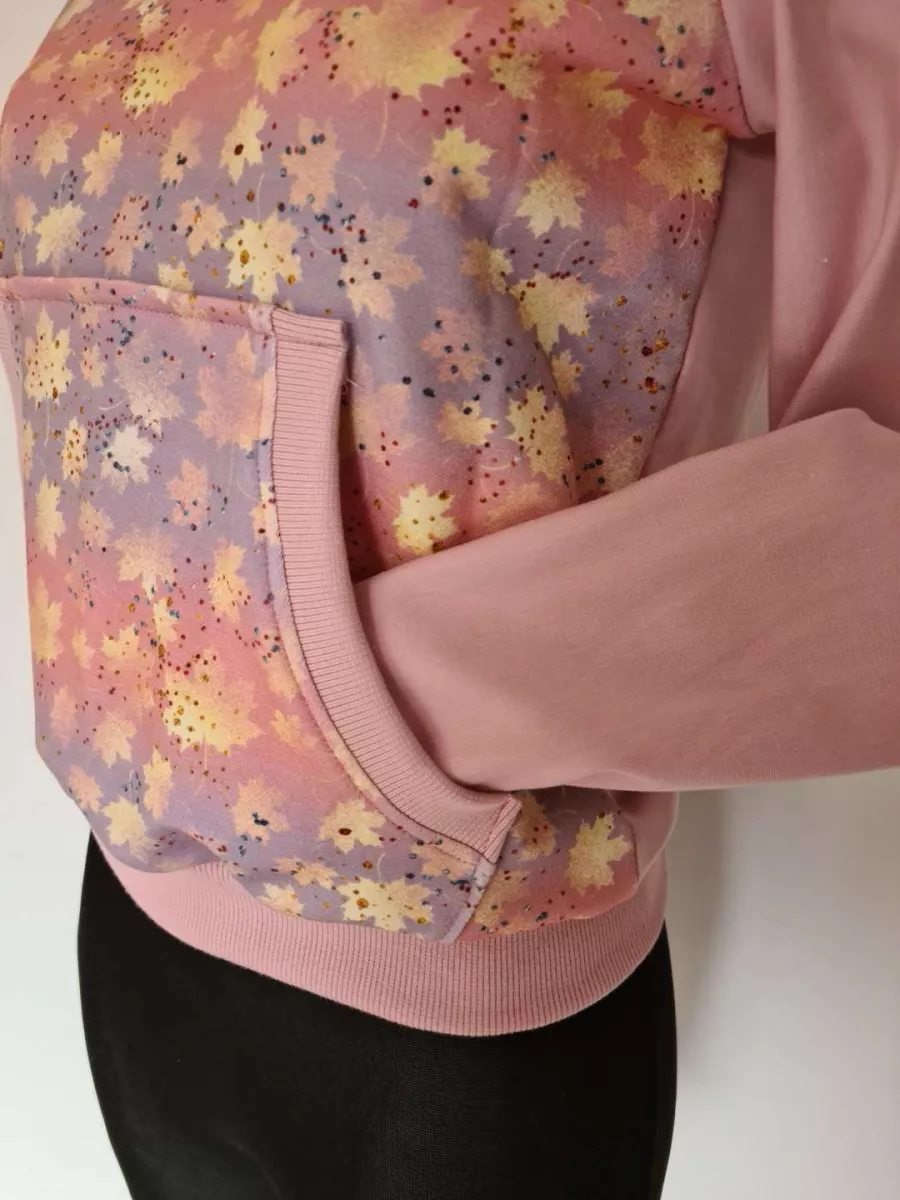 A sweatshirt with a beautiful yellow leaf print, a large kangaroo pocket finished with a stunning ribbed cuff, and ribbed cuffs, hem, and neckline. Size S, also fits M. Color: dark powder pink.