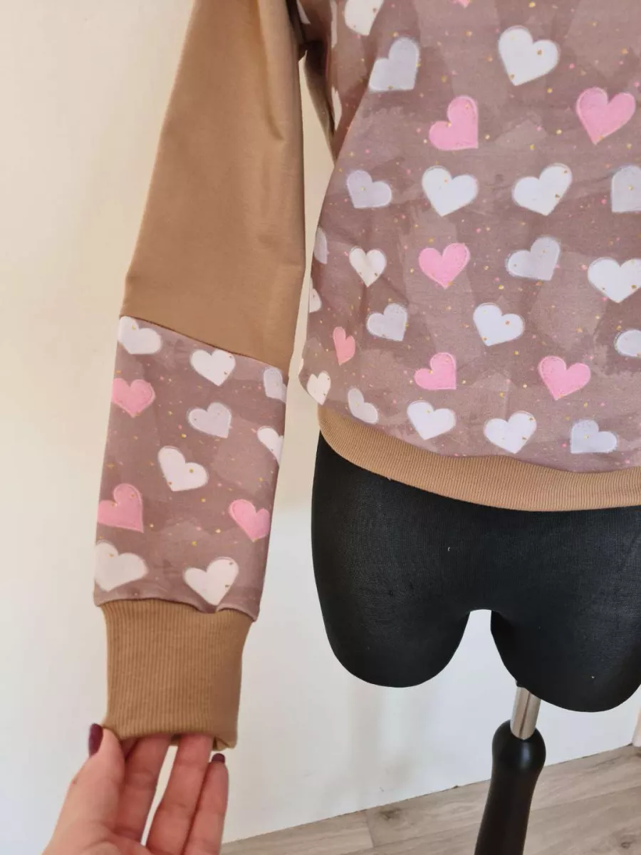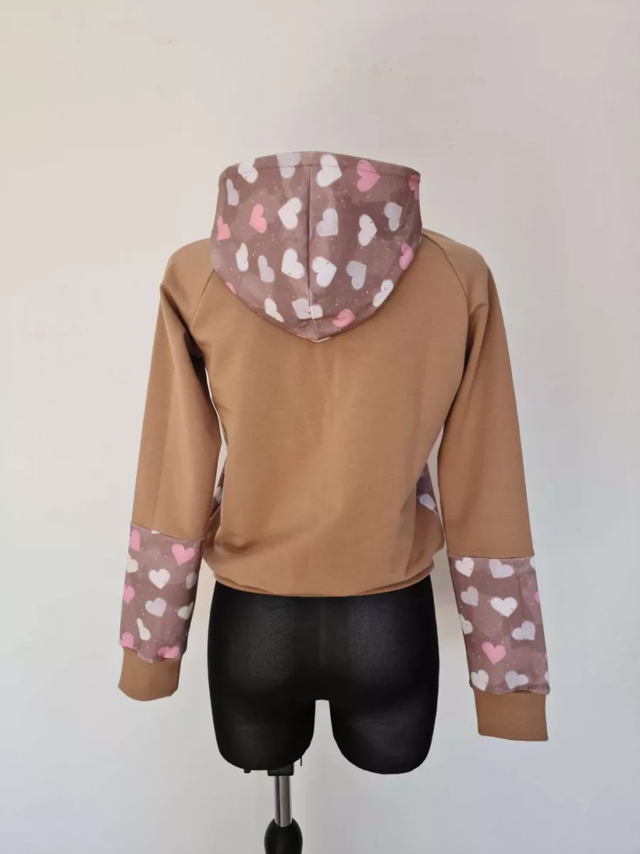 Dresowa bluza z kapturem, wstawki na rękawach w serduszka, rękaw raglanowy, bluza wykończona ściągaczem prążkowanym, dresówka brązowa i w serduszka, 98% bawełna I 2% elastan, produkt handmade, pasuje na S oraz M, kolor brązowy.