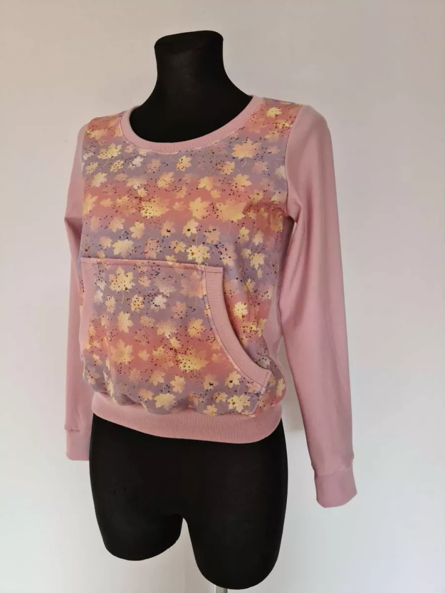 Bluza dresowa z pięknym printem żółtych liści, duża kieszeń kangur wykończona ściągaczem który super się prezentuje, rękawy, dół oraz dekolt wykończony ściągaczem, rozmiar S, pasuje również na M, kolor - ciemny pudrowy róż.